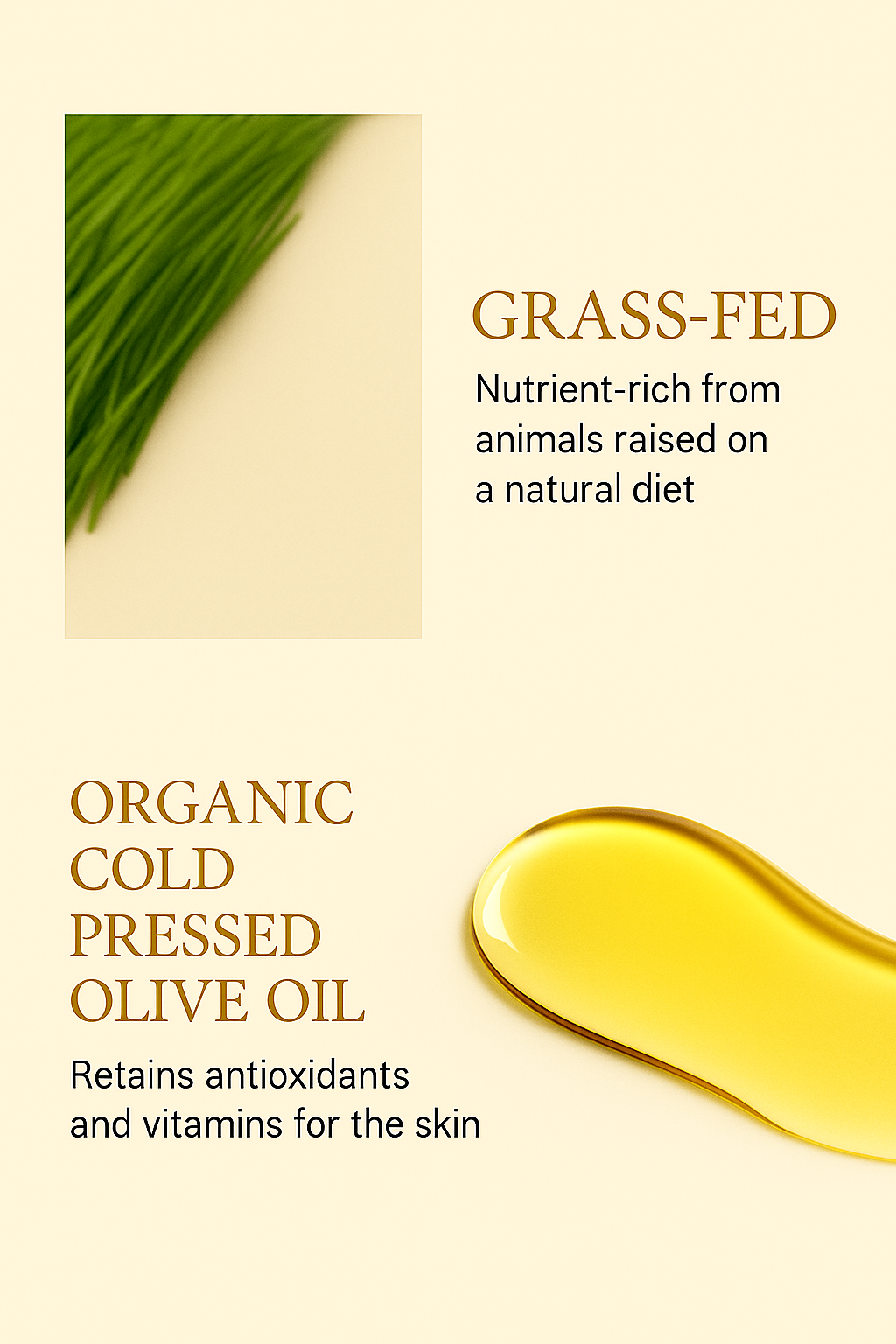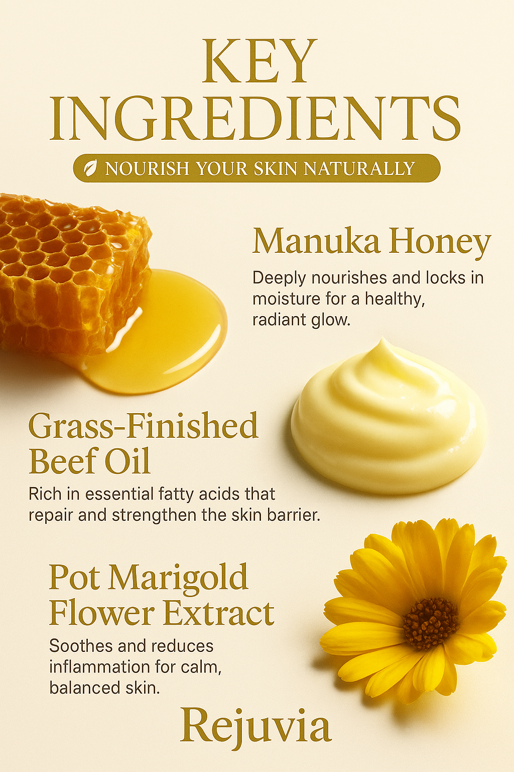 Answer 1: The cream features a premium blend of grass-fed beef tallow and Manuka honey. Grass-fed beef tallow is rich in nutrients and mimics the natural oils in your skin, providing deep hydration and supporting the skin barrier. Manuka honey is known for its antibacterial and healing properties, making it effective for nourishing and restoring the skin's vitality.